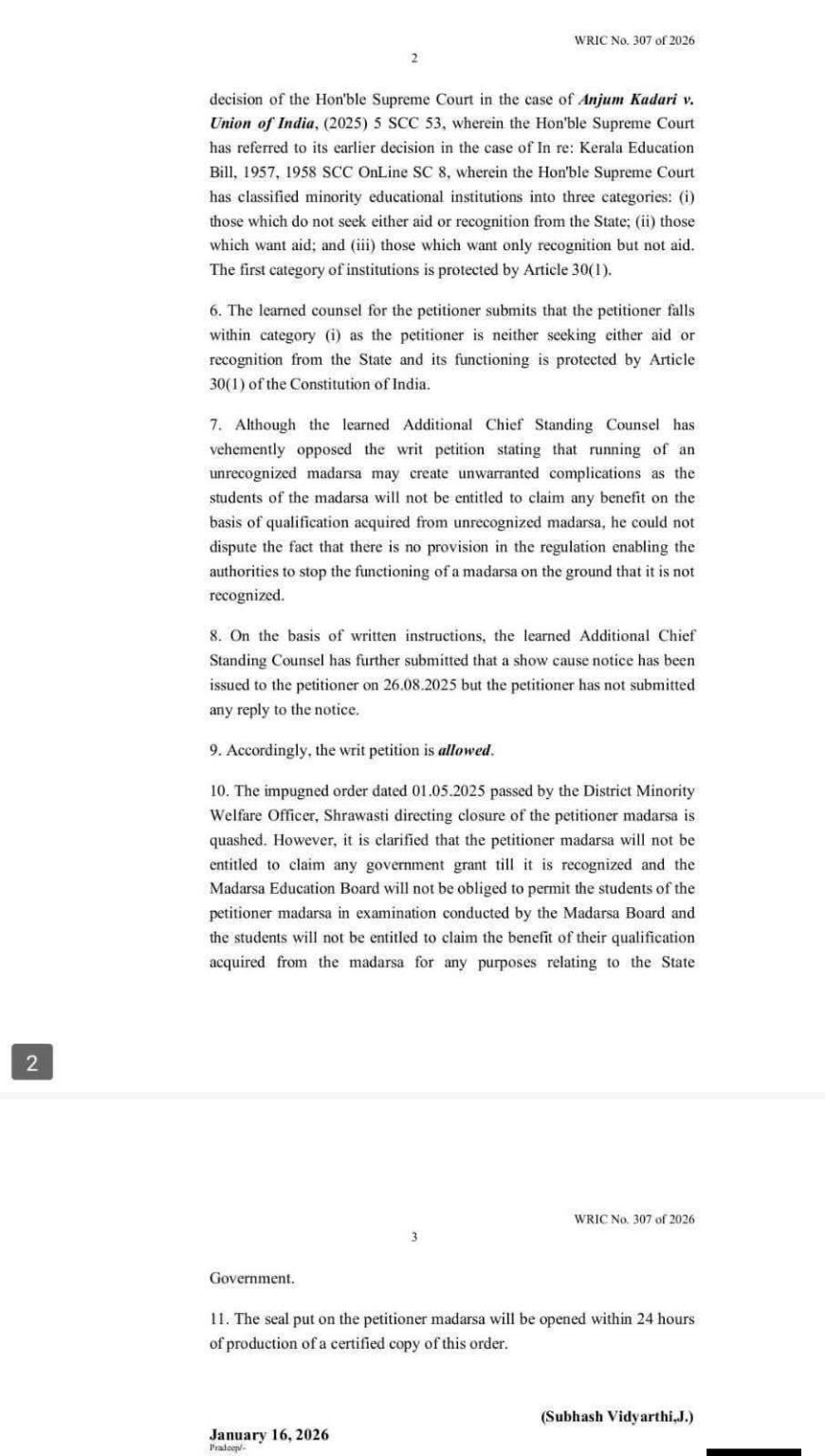 🏛️ निष्कर्ष:- कानूनी जानकारों के अनुसार, यह फैसला सिर्फ मदरसों तक सीमित नहीं है, बल्कि देश में अल्पसंख्यकों के शैक्षणिक अधिकारों की रक्षा की दिशा में एक बड़ी न्यायिक जीत है। यह आदेश आने वाले समय में प्रशासनिक मनमानी के खिलाफ एक मजबूत ढाल साबित होगा।
