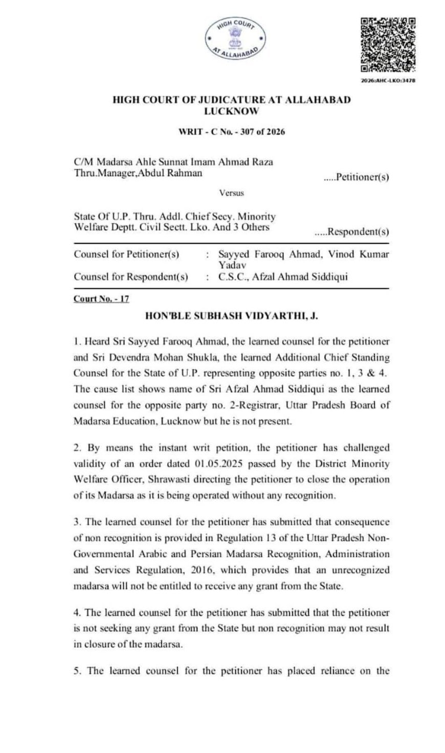 रिट संख्या 367/2026 की सुनवाई करते हुए माननीय न्यायमूर्ति सुभाष विद्यार्थी ने श्रावस्ती के जिला अल्पसंख्यक कल्याण अधिकारी द्वारा जारी उस आदेश को पूरी तरह रद्द कर दिया, जिसमें एक मदरसे को बंद करने के निर्देश दिए गए थे।